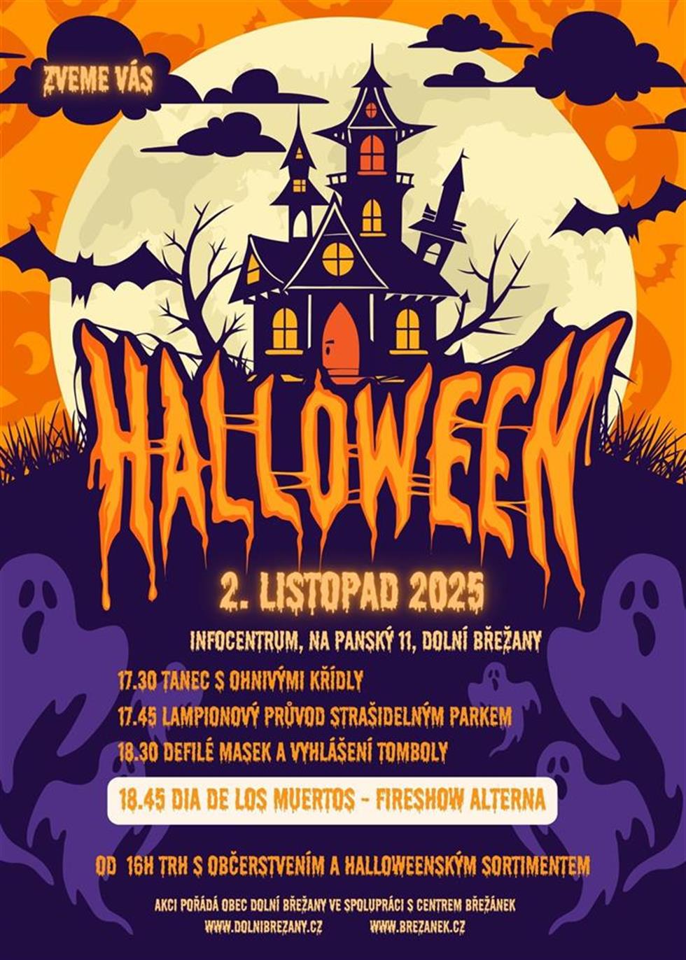 Čeká vás:od 16:00 trh s občerstvením a halloweenským sortimentem17:30 Tanec s ohnivými křídly17:45 Lampionový průvod strašidelným parkem18:30 Defilé masek a vyhlášení tomboly18:45 Día de los Muertos – Fireshow Alterna