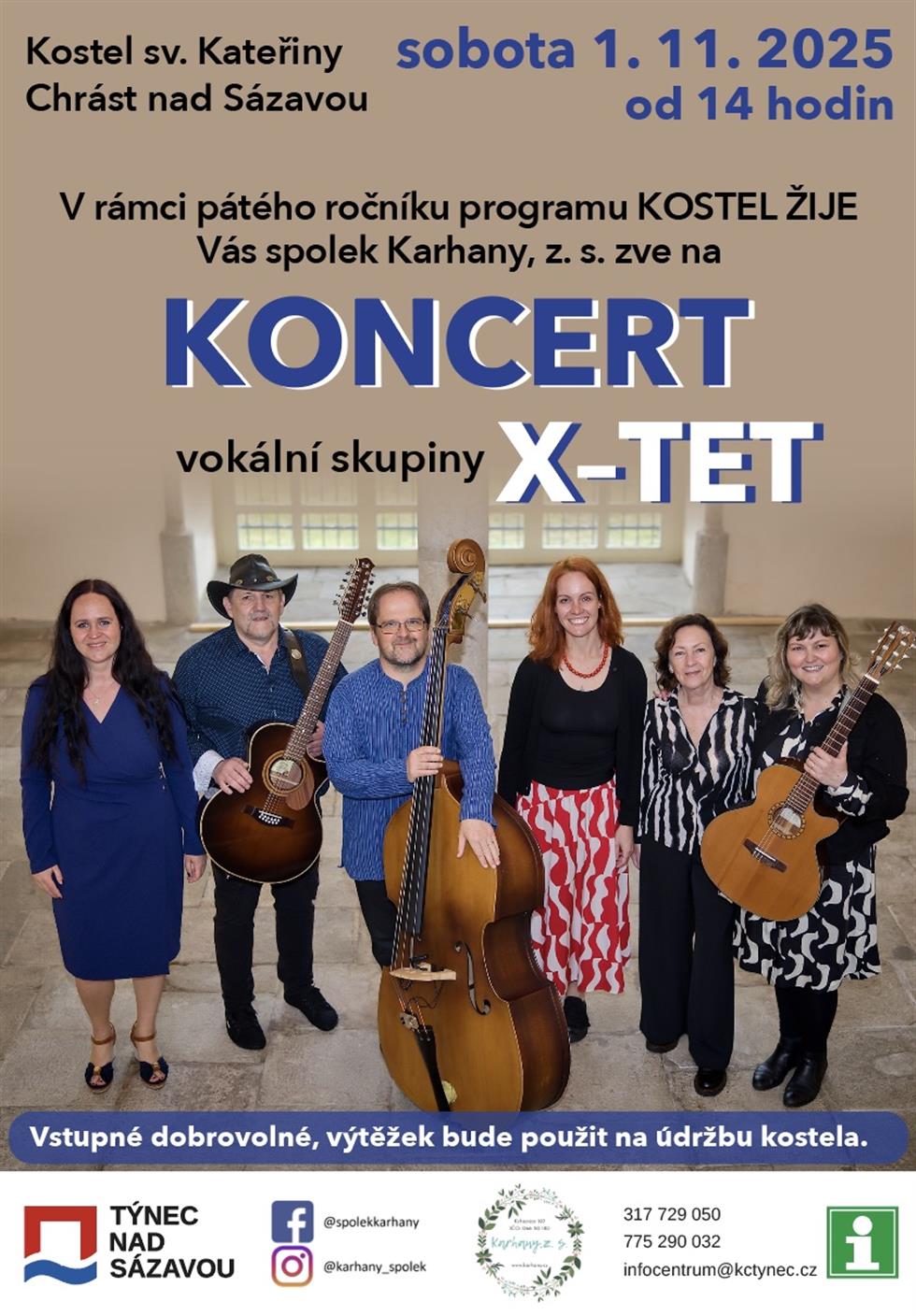 V rámci pátého ročníku programu KOSTEL ŽIJE Vás spolek Karhany z.s. zve na koncert vokální skupiny X - TET.