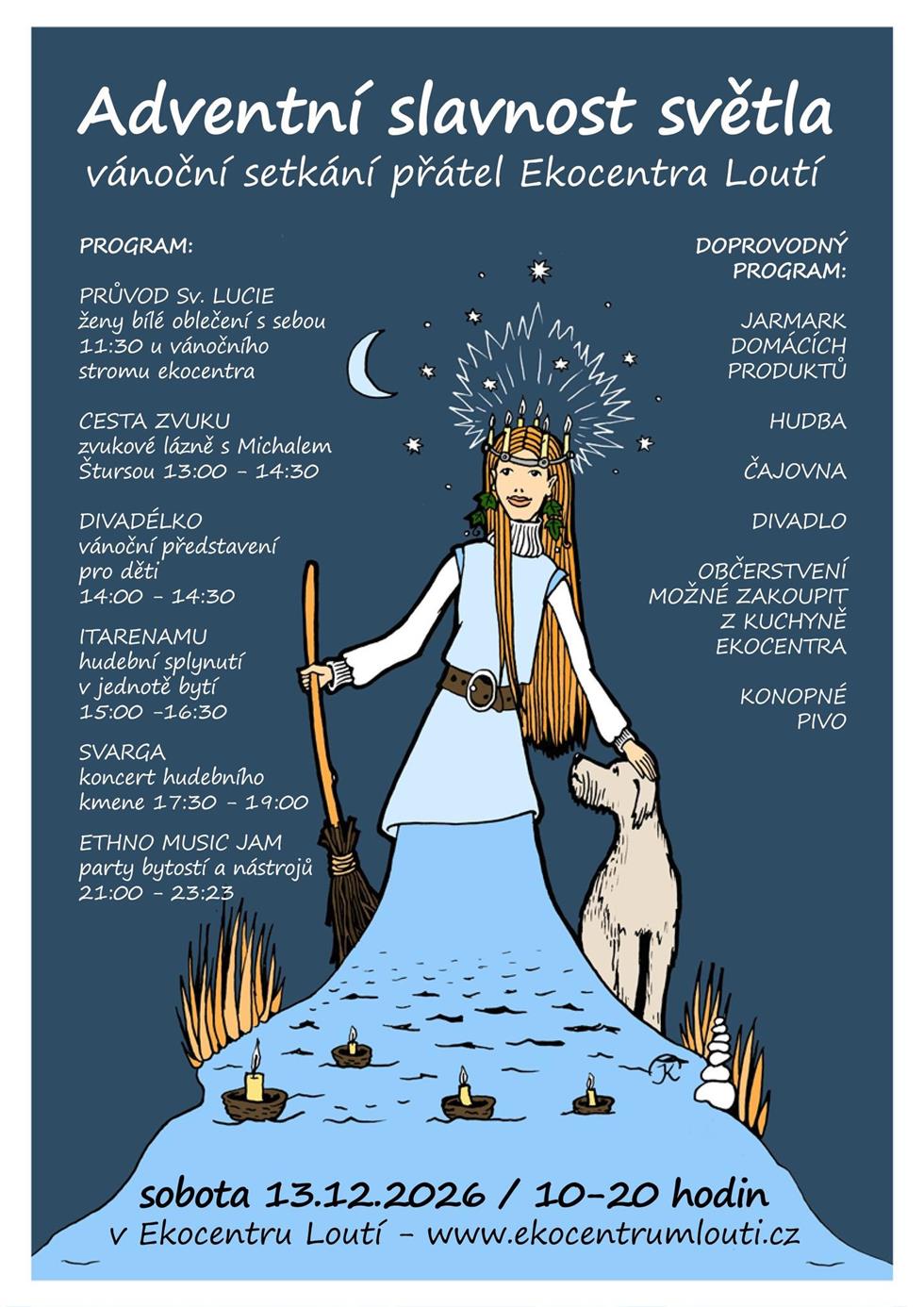 Již tradičně proběhne očistný průvod Lucii – bylinnými vykuřovadly čistit celý prostor Ekocentra Loutí a zažehnou vykřesnaným ohněm svíce v menhirovém kruhu.